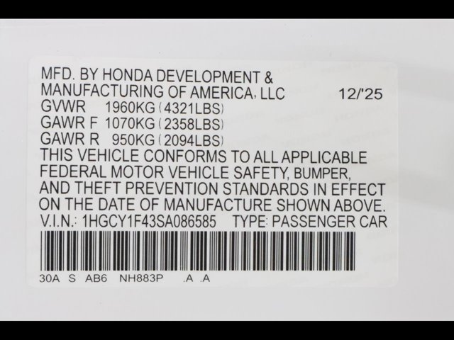 - VIN : 1HGCY1F43SA086585