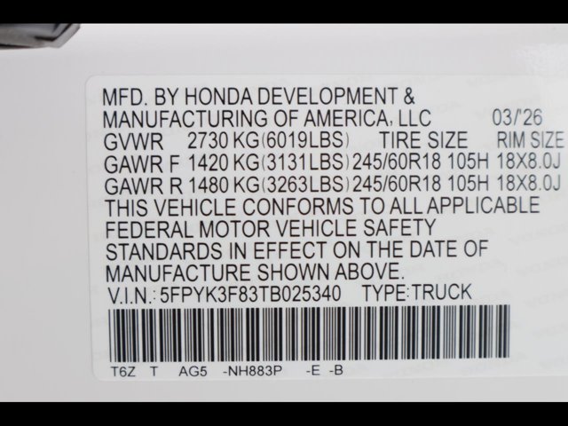 - VIN : 5FPYK3F83TB025340