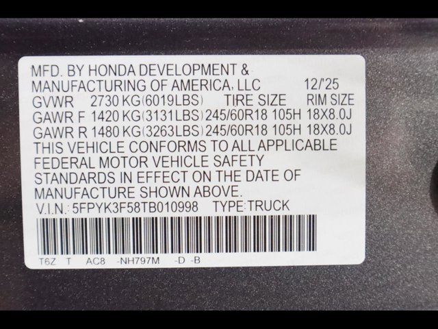 - VIN : 5FPYK3F58TB010998