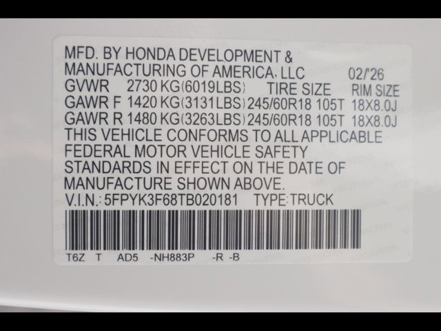 - VIN : 5FPYK3F68TB020181