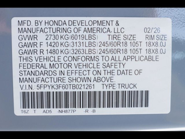 - VIN : 5FPYK3F60TB021261